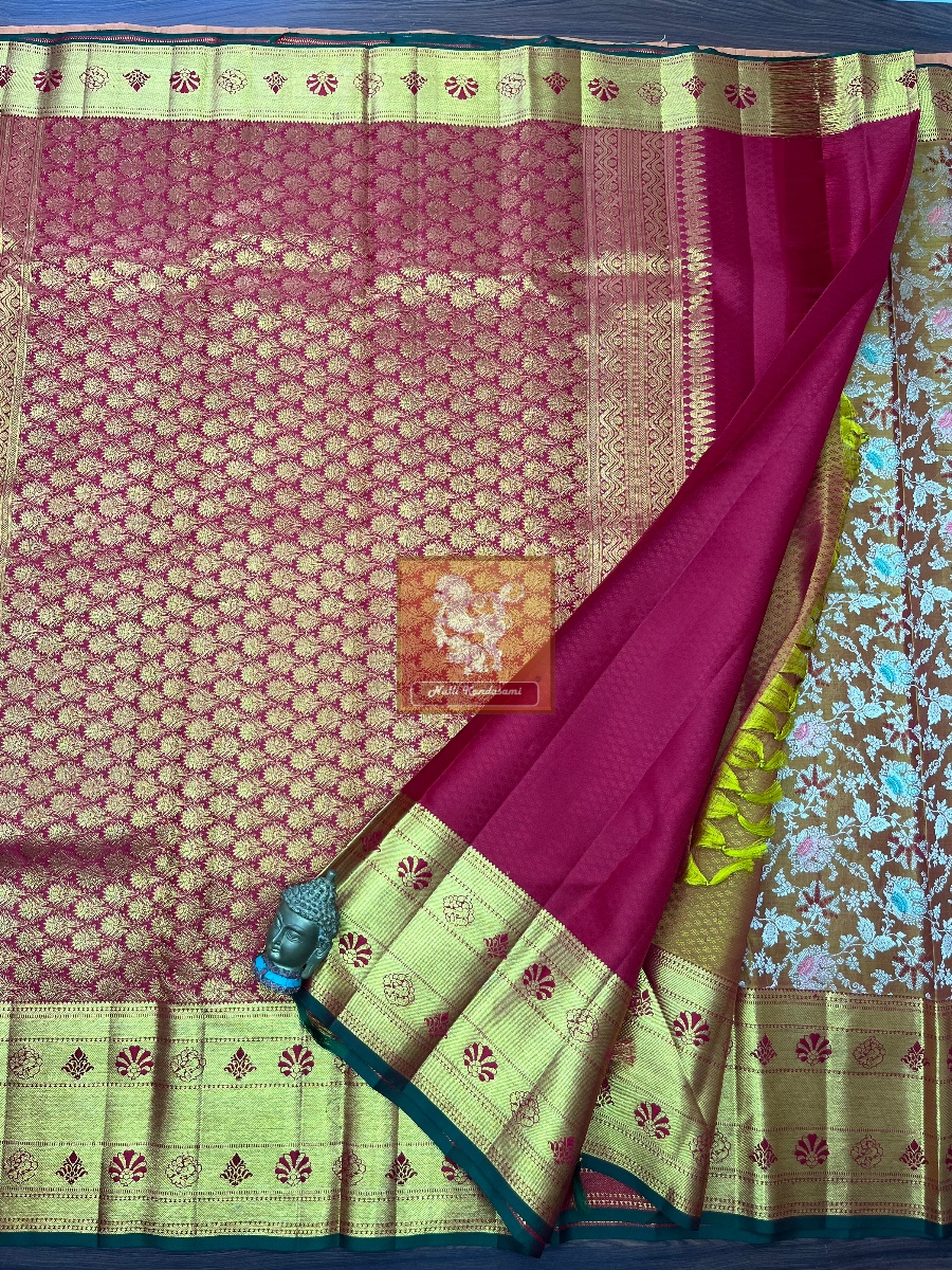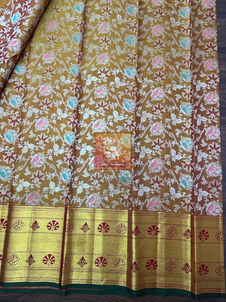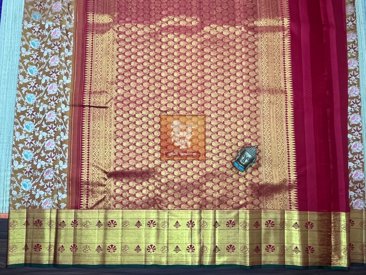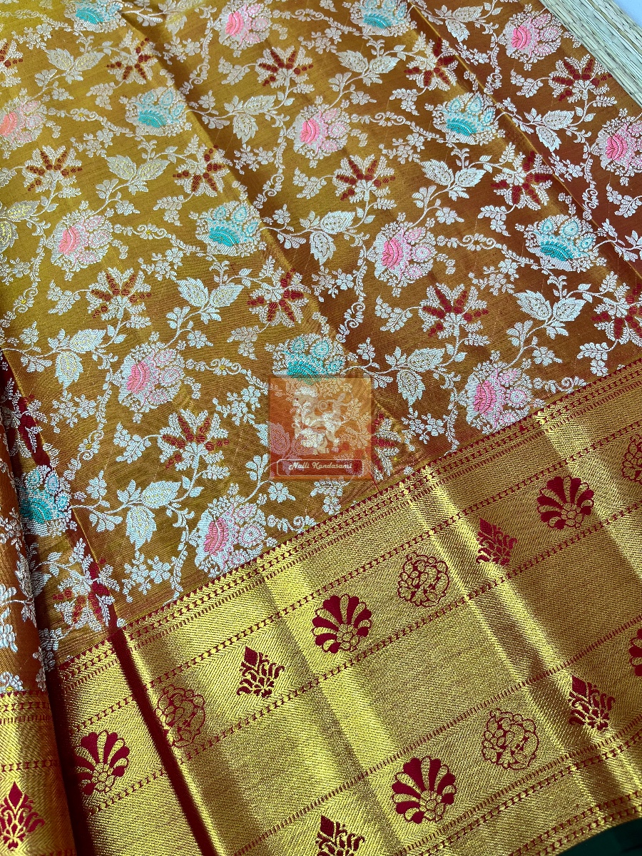 Add a pop of color to your wardrobe with our Mustard Meenakari Handloom Kanjivaram silk saree. Handcrafted with the finest silk, this saree is both elegant and comfortable to wear. Elevate your style and make a statement while supporting traditional Indian art with this stunning saree.