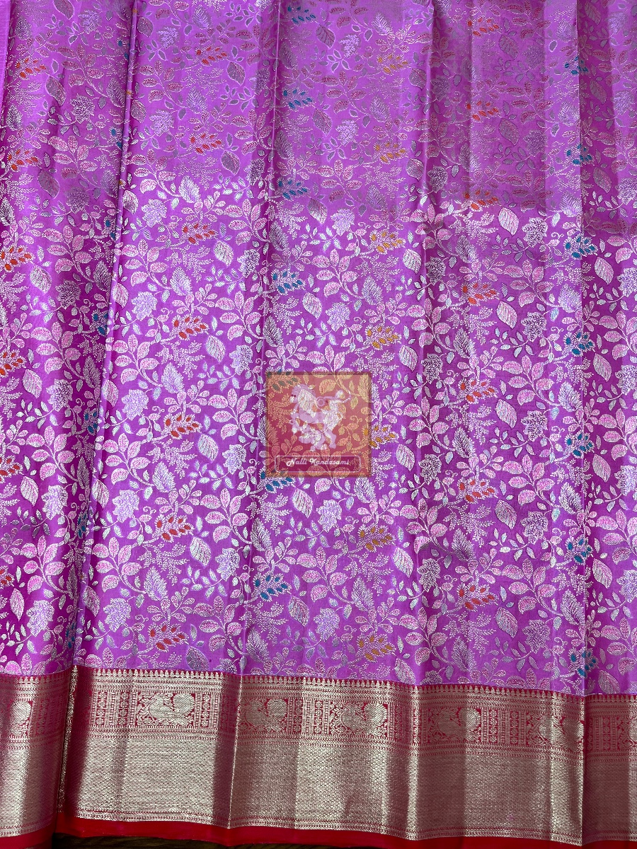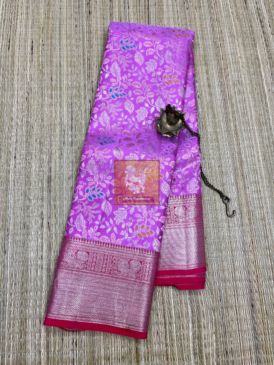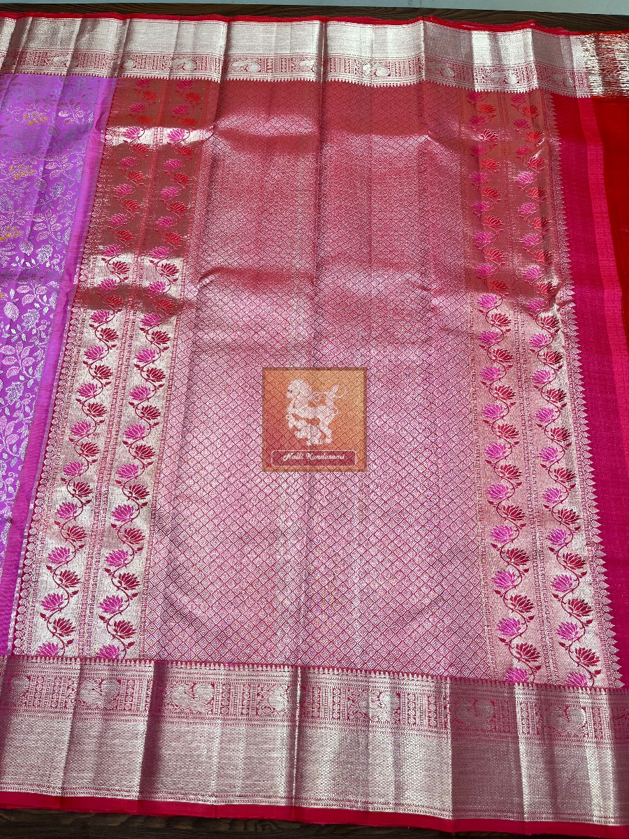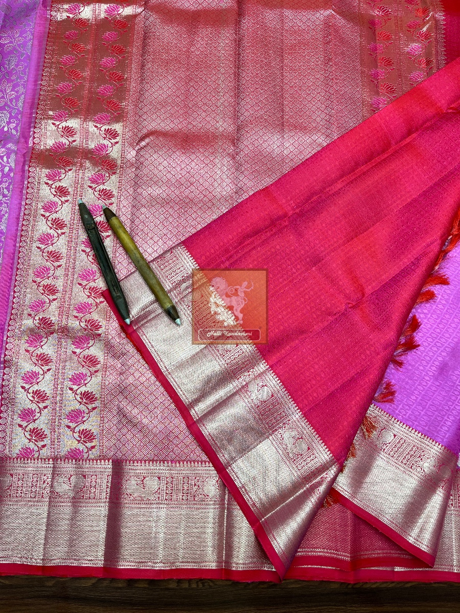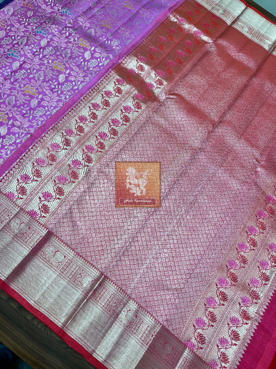 Elevate your bridal look with our Icey Violet Korvai Bridal Kanjivaram Meenakari Pure Silver Zari Silk Saree. Exquisite craftsmanship and intricate detailing make this saree a timeless piece. Made with pure silk and adorned with pure zari work, it adds a touch of luxury and elegance to your special day.