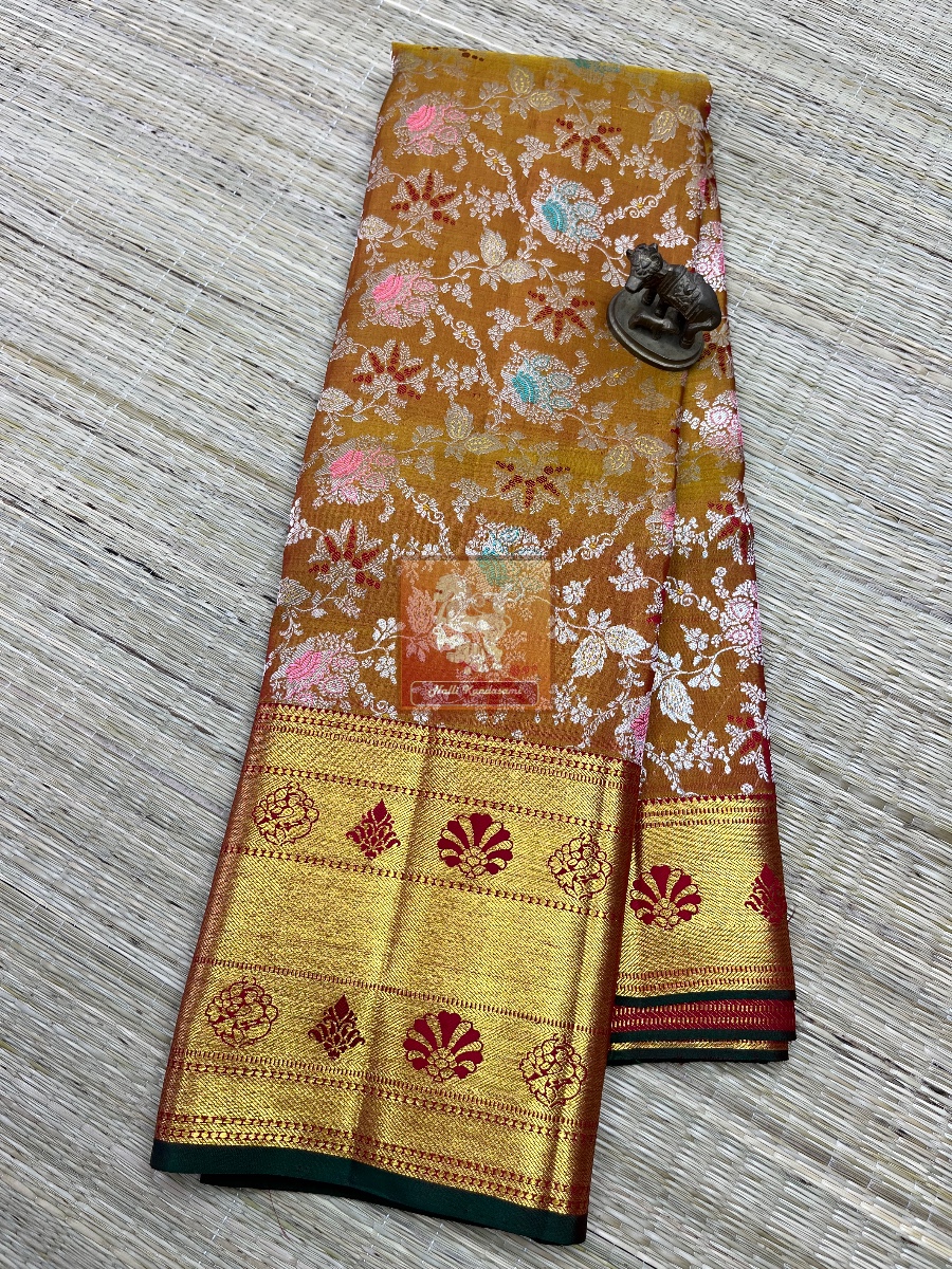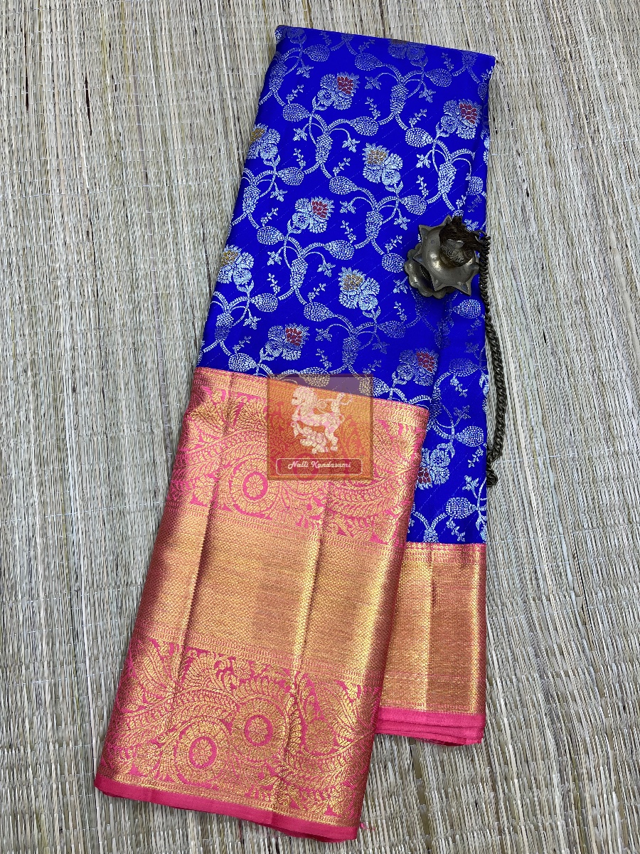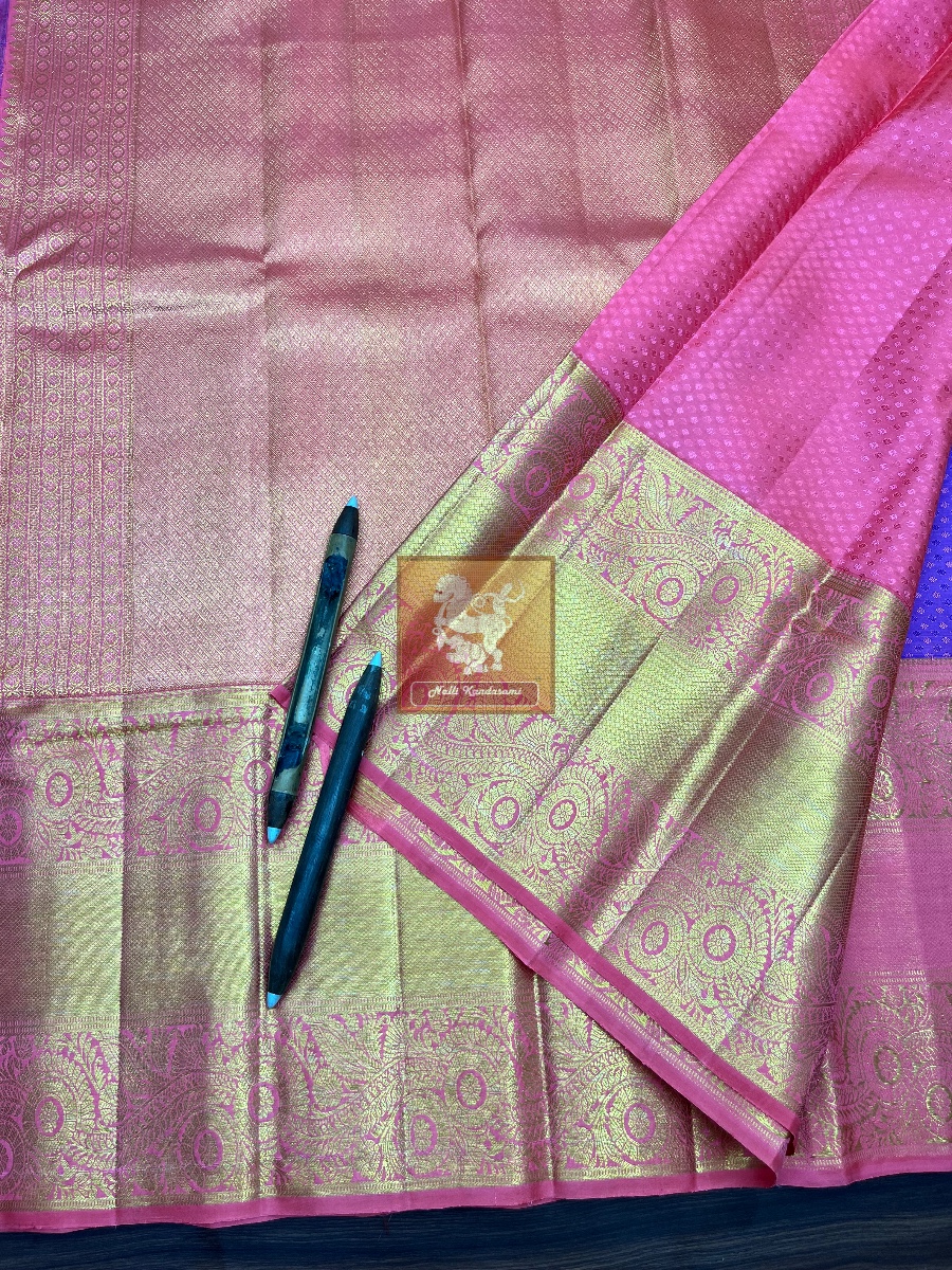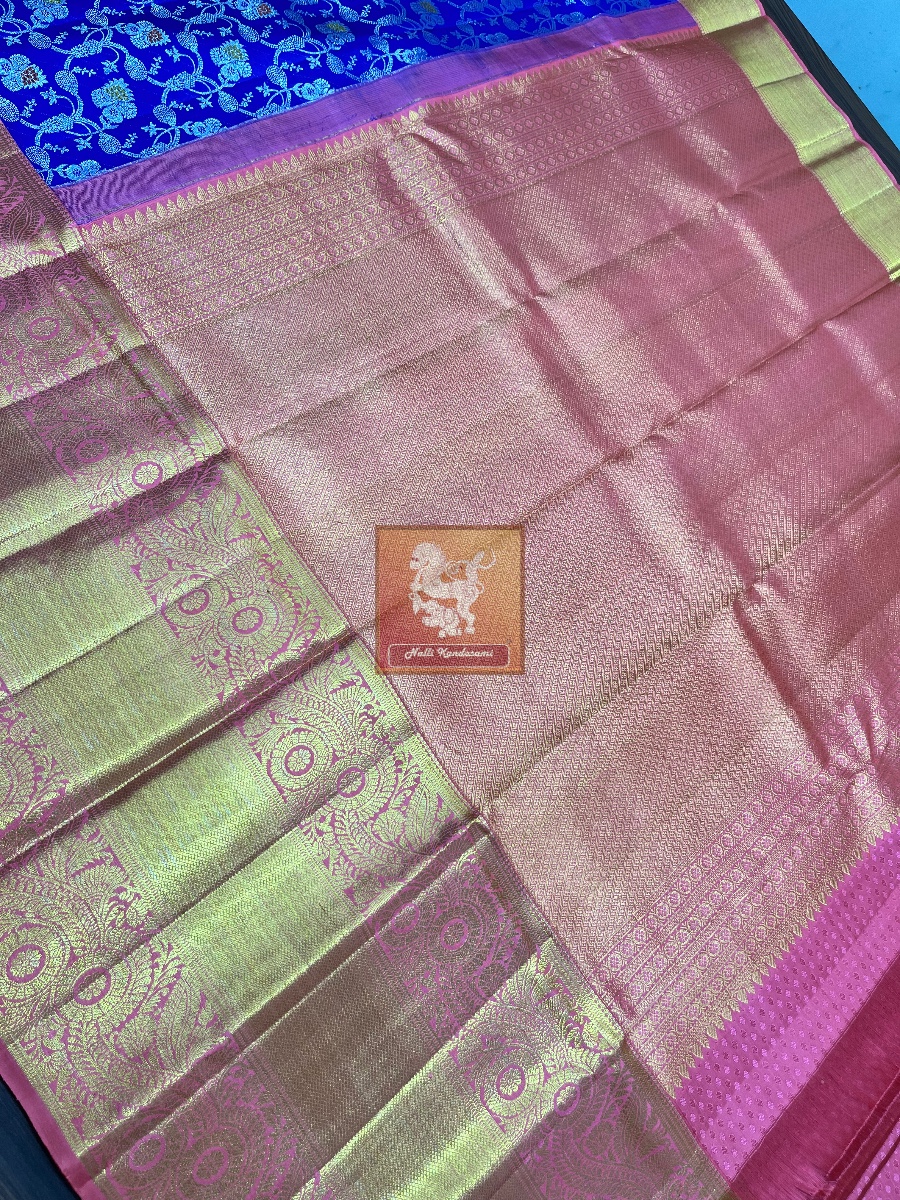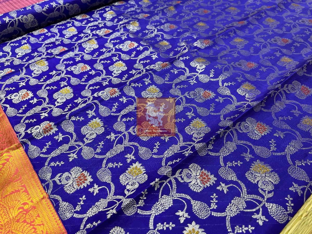 Nalli Kandasami kanchipuram brings you the Korvai Meenakari Bridal Kanjivaram Saree, a masterpiece of intricate craftsmanship and time-honored tradition. Woven with pure silk and pure zari, this saree showcases the exquisite floral motif, inspired by the beauty of nature. Designed with vibrant tones, it is perfect for brides who seek a blend of grace, subtlety, and grandeur on their special day.